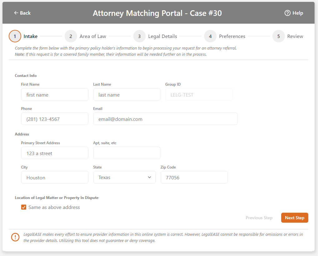 Form to input basic contact information for the primary policy holder to begin processing request for an attorney referral.