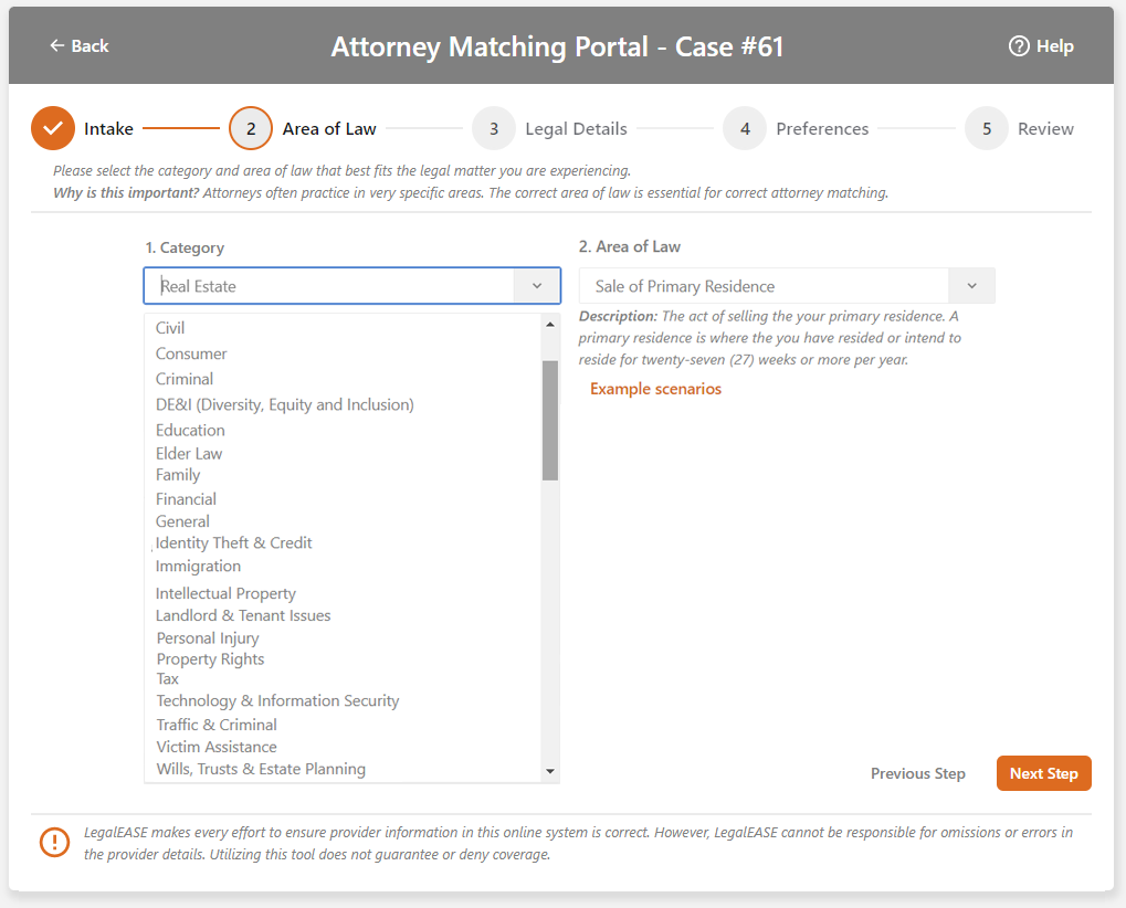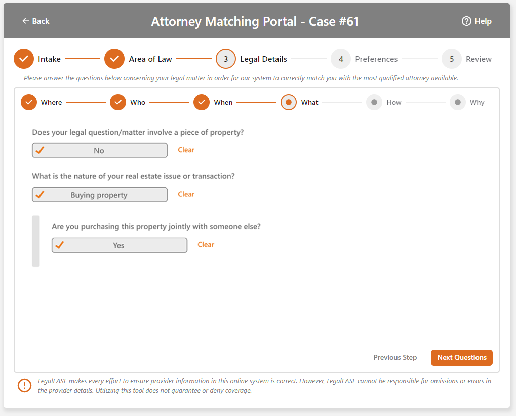 • The online intake process is a simple 5 step process with targeted questions pertaining to the specific legal matter selected.