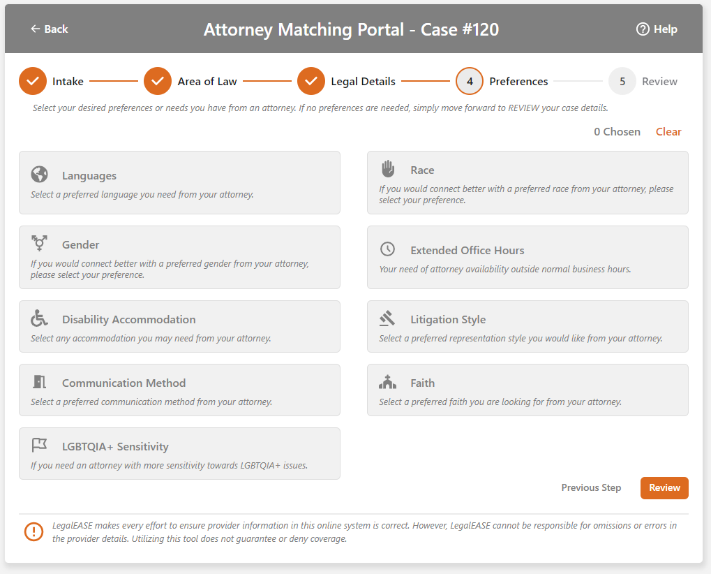Options ranging from language, disability accommodations, communication methods and additional DE&I (Diversity, Equity and Inclusion) needs members can choose, building their desired attorney profile.