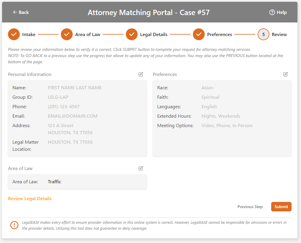Verify all the information input is correct and submit case into the LAMP system for attorney matching services. A confirmation email is sent to member with all the details of the legal case.  Once the system has identified an attorney matching the case, members are emailed contact information of the matching attorney.